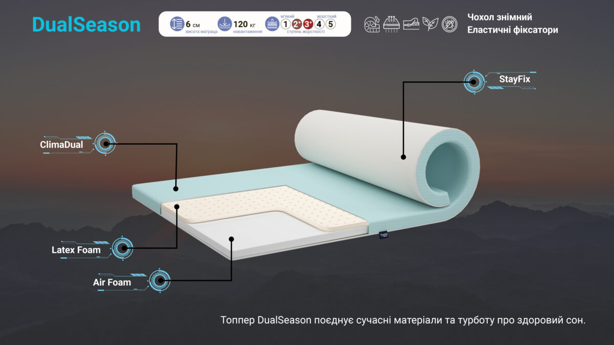 Топпер DualSeason поєднує сучасні матеріали та турботу про здоровий сон. ClimaDual адаптується до сезону: у спеку дарує приємну прохолоду, взимку — допомагає утримувати комфортну терморегуляцію тіла.